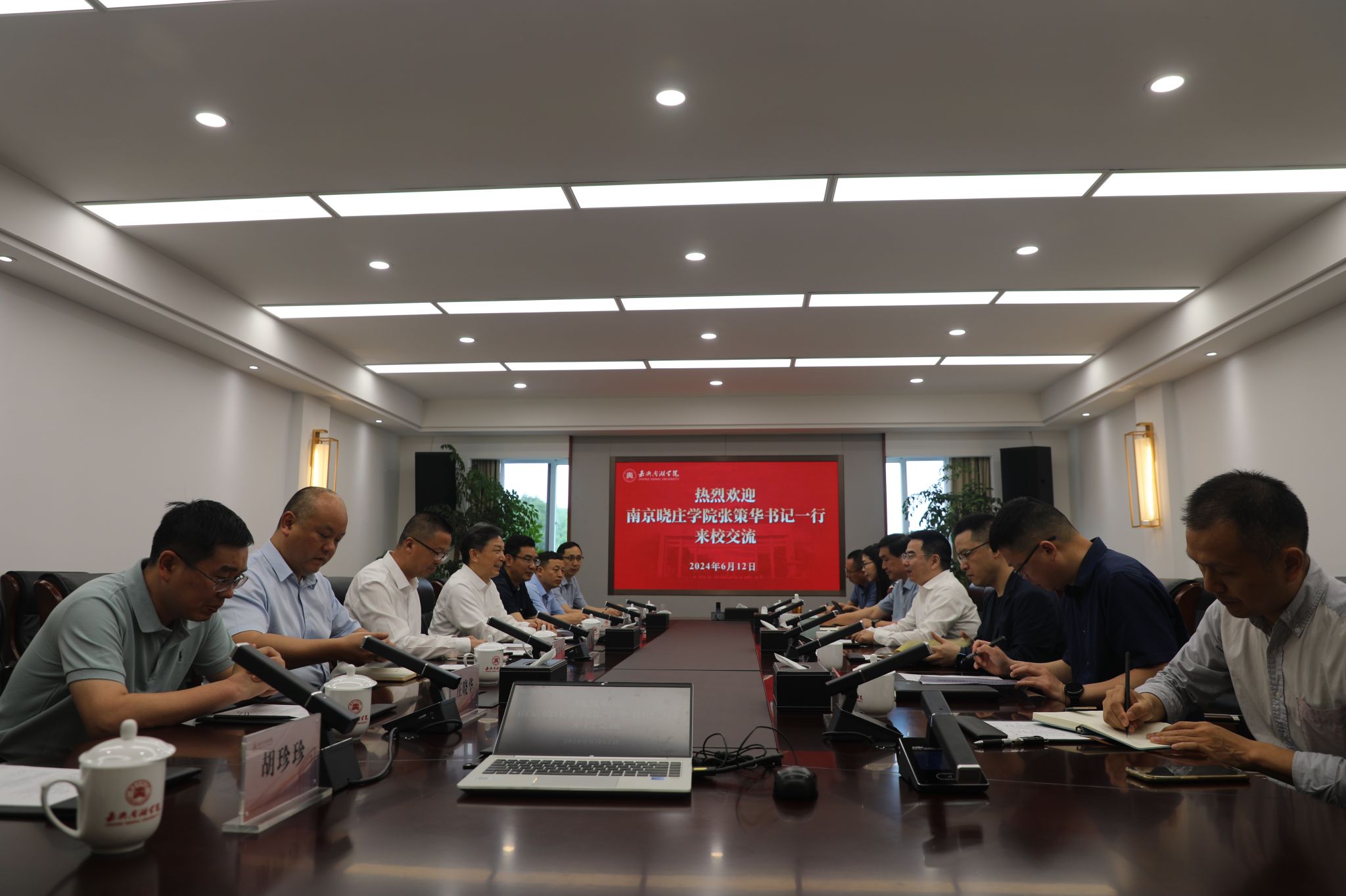 6月12日上午,南京晓庄学院党委书记张策华率队来访,我校党委书记倪沪平、校长贾文胜接待张策华一行。双方就高校党建品牌培育、应用型本科高校专业设置、育人体系建设、校园文化打造等方面工作开展深入交流。交流座谈会前,贾文胜和我校党委副书记沈岱峰陪同张策华一行参观学校。