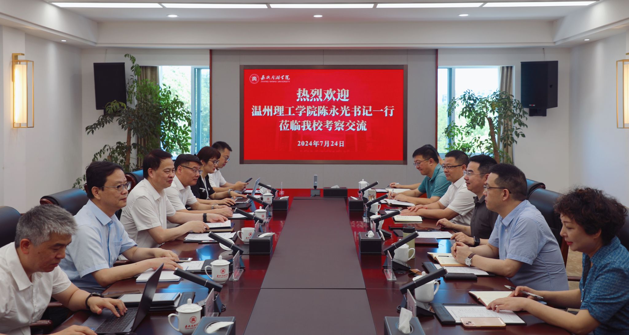7月24日上午,温州理工学院党委书记陈永光率队来访,我校党委书记倪沪平,校长、党委副书记贾文胜接待陈永光一行。双方就应用型本科高校发展路径、地方高校与城市产业的互融互促、育人体系建设、人才引进及培养、学科专业设置、校园文化打造等方面工作展开深入交流。